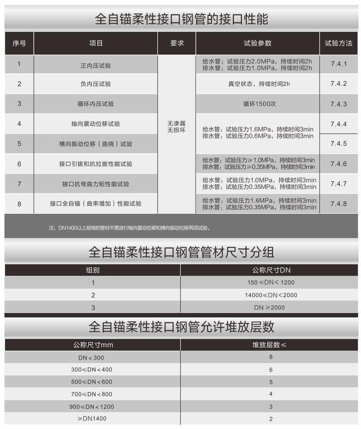 ①全自錨(抗震型)柔性接口鋼管不但具有防止軸向拉脫和橫向彎曲脫口的全方位自錨功能,而且還可通過接口的傳力,令管道可通過連續(xù)疊加多個接口的可移量,增加管道的位移量和管線變化的曲率,適應管線更大的不均勻沉降和變化,成為可安全跟隨地面位移和地形變化防止接口滑脫的管型。