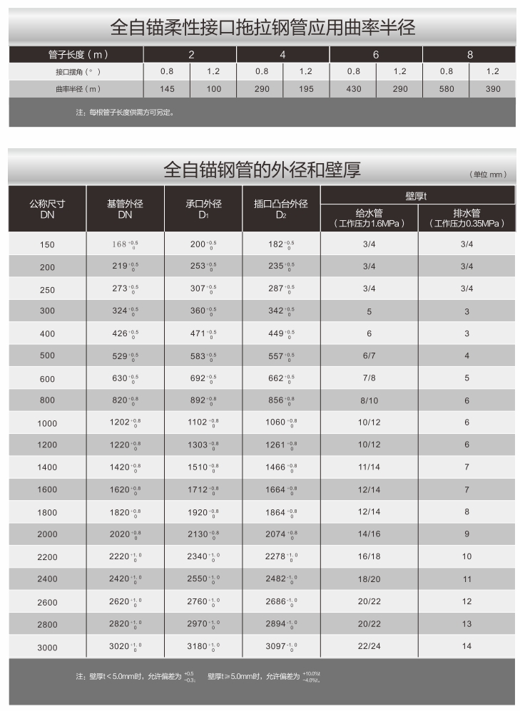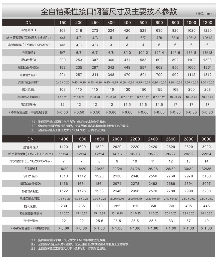 適合埋地、管廊明敷設施、非開挖頂拖管、和輸送直飲水(可消除管道對水質二次污染)的全自錨柔性接口鋼管和不銹鋼襯里復合鋼管。